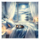 This dreamy coastal scene captures the serenity of a moonlit night, as soft blue and silver hues bathe a cozy bedroom in gentle glow. Billowing white curtains frame the open window, where moonlight dances across calm ocean waves and distant cliffs. A calico cat curls peacefully atop the rumpled bed, adding a quiet charm to the intimate, cottagecore-inspired setting. Lanterns and fresh flowers enhance the sense of warmth and stillness, while the soft textures and layered linens evoke a tranquil, lived-in feel. Perfectly blending cozy coastal aesthetics with a touch of whimsy, this artwork invites you into a peaceful night of rest by the sea. AI generated artwork.