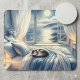 This dreamy coastal scene captures the serenity of a moonlit night, as soft blue and silver hues bathe a cozy bedroom in gentle glow. Billowing white curtains frame the open window, where moonlight dances across calm ocean waves and distant cliffs. A calico cat curls peacefully atop the rumpled bed, adding a quiet charm to the intimate, cottagecore-inspired setting. Lanterns and fresh flowers enhance the sense of warmth and stillness, while the soft textures and layered linens evoke a tranquil, lived-in feel. Perfectly blending cozy coastal aesthetics with a touch of whimsy, this artwork invites you into a peaceful night of rest by the sea. AI generated artwork.