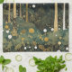 En fantastisk och förtjusande skogsplats med en djup grönt och guld palett. Tall, stiliserad träd med gyllene trunkar och grenar når fram till en mörk himmel, deras armar och ben som adorberats med glödande, sfäriska frukter eller blommar. Förgrundsbilden är en tät tapesi av detaljblad, fylld med stiliserade blommor och växter i nyans av grönt, grädde och skuggande guld. Ljusbågar flyter genom luft och vila på marken och skapar en magisk atmosfär som påminner om en drömlik skogsmark. Den övergripande sammansättningen är mycket dekorativ, med ett platt perspektiv och intrikat mönster som fyller arbetsytan.