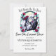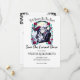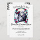 Låt dina gäster veta att spara datumet för ett bröllop som är lika magiskt som himmel natten med det här fantastiska gotiska "Spara datum"-kortet. Den här fantastiska designen har en romantisk skelettbrud och en trimning som delar ett ömtåligt ögonblick under ett glansande fullt måne. De är vackert inramade av en båge av pulserande magenta ro och tealvinstockar, som skapar en scen av evigt kärlek. Det är perfektens sätt att tillkännage ert åtagande till döden Do Us Part. Lägg bara till ert datum namn och bröllop och låt alla veta att en formell inbjudan är på väg.