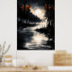 En stillastående marshland badade i lunarradians, där den stillastående vatten spegel blickar mot fullt måne. Silhouetted träd står emot en mistnatt, deras löv som är försedd med en autolog orange som tillför värme till monokromlandskapet. I den här teckningen fångas den mystiska tystnaden från en nattlig våtmark, perfekt för älskare av moody, atmosfärisk konst och sann naturinspirerad konst.