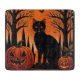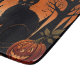 En slimmad svart katt sitter under ett glanande fullt måne och kastar en enigmatisk silhuett mot den vibrerande orangen himmel. Silhouetted träd och pumpor som är spridda nedanför tillför stollig en aning till scenen. Visste du att katter i gammal Egypten omringades som helig och ofta var associerade med gudinna Bastet, som representerade skydd, njutning och bra hälsa? Den här teckningen fångar Halloween-nattens mystik och kattdjurets varaktiga anslutning till övernaturen.