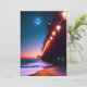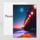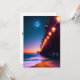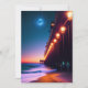 Ett vackert hälsningskort för strand älskare har en pir med tända lamoster och en glödande fullt måne i skymningen. Design skapades med AI-software. Anpassadet "tänkande på dig" text