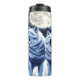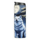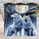 Två stora vita varger med piercing gult ögon är varnade i en skog med dammning från snö under mjuk glöd från ett stort måne. Mörk gräs träd omger dem, deras grenar täckte lätt i snö. Några fåglar flyger i silhuven mot det månbelysta himmel och skapar en serene och vaksam vinterscen.