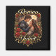 An ornate, moonlit illustration of Romeo and Juliet locked in a tender embrace amid roses and golden filigree.