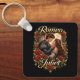 An ornate, moonlit illustration of Romeo and Juliet locked in a tender embrace amid roses and golden filigree.