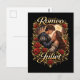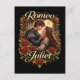 An ornate, moonlit illustration of Romeo and Juliet locked in a tender embrace amid roses and golden filigree.