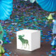 Denna utformning är konturen av en älg med en grönt för beige färg-gradient och silhuetten av träd inuti.