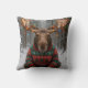 A moose humorously sports an ugly Christmas sweater and is adorned with brightly colored lights tangled on its antlers as it sits in a snowy forest