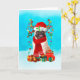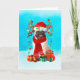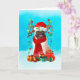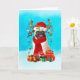 Mops som njuter i snö med julklappar iförd tomtehatt och med julbelysning är en perfekt presentidé för någon som älskar denna hundras