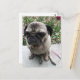 Mops im Garten vor der Blumenwiese. Schöne Postkarte für Hundeliebhaber.