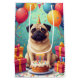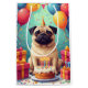 En rolig och glad födelsedagsscen med en Mops som njuter av en festlig firande omgiven av färgglada ballonger, presenter och en ljus födelsedagstårta. Det lekfulla uttrycket och livliga detaljerna skapar en glädjefull design full av charm och personlighet