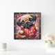 Denna söta fyrkantiga väggklocka har en rörande digital illustration av en storögd mopsvalp med djupt blå, skimrande ögon. Valpen håller glatt i ett stort, utsirat rött hjärta med det romantiska budskapet "Love you" i elegant vit skrivstil. Hjärtat är dekorerat med mindre färgglada hjärtaccent och skimrande gnistor. Bakgrunden är en livfull explosion av rosa, lila och gyllene nyanser, fylld med svävande ballonger, fantasifulla virvlar och blommande blommor. Konsten är placerad i en modern svart trästrukturerad ram med djärva vita numeriska markörer för enkel läsbarhet. Denna funktionella heminredning är en perfekt dekorativ pjäs för hundälskare eller som en söt present på Alla hjärtans dag. Dess högenergiska färgpalett och charm