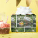 En serenscen skildrar en vit gås som står på en damds strand och tittar på en gässling som flyter i ett färgstarkt uppblåsbart ring