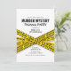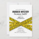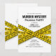 Mordgåta Födelsedagsinbjudan med modern design med gul varningsmönster och texten 'brottsplats, passera ej'.
