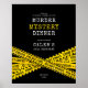 Mordmysterium välkomstskylt med gula polislinjer.