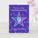 Låt din dotterdotter känna extra speciell på hennes nionde födelsedag med denna glatta och färgstarka design! En stor vattenfärgsstjärna, som ger en blandning av lila, blues, pinkar och gröntar, tar sig i mitten mot en vit baksida av vinklar. Mindre texturerade stjärnor roterar runt och lägger till i roligten. Ett glatt sätt att säga: "Du är en stjärna i dag och varje dag!"