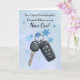 Gratulera din barndotter till glädjen i hennes egen bil med denna trevliga vinterdesign. En tvätta med vattenfärg sätter scenen, accentuerad av skarpt blått snöflingor och illustrerad nycklar för att markera denna spännande milstolpe. Vare sig det är hennes första uppsättning hjul eller en speciell gåva under frostsäsongen, fångar detta kort pridet och glädjen för hennes nya resa på vägen.