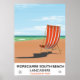 Morecambe South Beach Lancashire poster ,vintage resor poster av en strimlad däcksstol på en sandstrand.