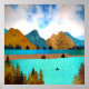 Ett abstrakt med ett unikt struktur som visar en bergsplats och sjö med en solitär rowboat och en fantastisk soluppgång och solstrålar i blå, teal, cyan och guld.