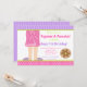 Inbjudan till Morgonrock Pyjamas och Pannkakor Party för det speciella tillfället. Bakgrunden har lila ränder och rosa prickar. Orden kan ändras för att passa dina egna önskemål.