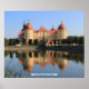 Moritzburg Castle, Tyskland, med orangen, Baroque-domer på de fyra torn och gult väggar som reflekterar i sjö.