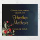 Fintvätt, sofistikerad och elegant studentfest som mousserar vin med en enkel, men vacker blommigt arrangemang på grund lämnat hörn med vackra rödblommor och komplikerade botaniska gröntar. Elegant guld anpassade typografi för händelseinformation på en midnattsblå övertoning för bakgrund. Grattisar student!