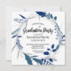 Mörk blått inbjudningar till blommigtens andningsceremoni eller inbjudningar till att anpassa sig till din speciella studentfest. Djup blåa blommor, löv och knopp med ett vackert skript typsnitt och sans serif typeface. Anpassa med ditt eget namn, studenten och andra uppgifter.