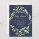 Trendiget och snyggtens babyduschinbjudan har en lafy grönt vattenfärg ram och modern typografi, på eleganten midnattblå bakgrund.