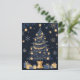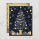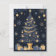 Det här vackert designade julkortet har ett elegant dekorerat Julgran med gyllene prydnadsföremål och ljus, med en lysande guldstjärna. Träd står på en framträdande plats mot en mörk med subtila löv mönster och små guldstjärnor som hänger runt den. Vid grund står "God jul" skrivet i elegantens gyllene manus. På kortets framsida fångas den festliga andan med dess invecklade och festliga utformning. På baksidan har kortet en tom vintage-stil-sida med dekorativt snöflingor, vilket ger gott om utrymme för att skriva ett personligt och hjärtligt meddelande. Perfekt för att skicka varmt helgdag till nära och kära.
