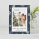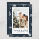 Blåsnowflake-fotojulkort med snöflingor på en mörk blått snöbakgrund. Anpassa det här fotojulkortet enkelt med ditt foto och din familj namn.