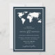 Dessa moderna inbjudningar till resetemat för bröllop har en vit världskarta på en rik, midnattblå bakgrund.