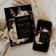 Den här eleganten har det moody bröllop spara datum-kortet en lush, romantisk blommigt bouquet i elfenben med ro faux foil och glitter foliage mot svart bakgrund. Anpassa ro rosa-texten i snyggt typsnitt på en svart rektangel och lägg till bröllop webbplats-URL:en på den helsvarta baksidan.