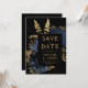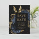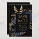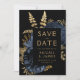 Den här eleganten har det moody bröllop spara datum-kortet en lush, romantisk blommigt bouquet i marinblått med guld faux foil och glitter löv på svart bakgrund. Anpassa guld-färgad-texten i snyggt typsnitt på en svart rektangel och lägg till bröllop webbplats-URL:en till den helsvarta baksidan.