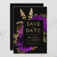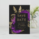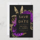 Den här eleganten har det moody bröllop spara datum-kortet en lush, romantisk blommigt bouquet i lila med guld faux foil och glitter foliage mot svart bakgrund. Anpassa guld-färgad-texten i snyggt typsnitt på en svart rektangel och lägg till bröllop webbplats-URL:en till den helsvarta baksidan.