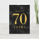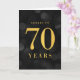 Chic 70:e födelsedagskortet med ord "Cheers to 70 Years" (Cheers to 70 Years) i faux guld-folie mot bakgrund av mörk grått bokeh ljus mönster. Om du vill lägga till text inuti kortet klickar du på knappen "Anpassa". *Observera att Zazzle Watermark som visas i zoomförhandsvisningen INTE visas på den färdiga tryckta produkten. © Rosewood and Citrus