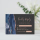 Det moderna bröllop OSA-kortet från elegantens lämnat kant har en marin blåfärgad agat gräns som trimmas med faux ro guld glitter. Texten finns i handskriftsskript för ro rosa och typsnitt för färgplatta på en svart bakgrund. Den omvända sidan har en matchande marin blå utformning och ro guld-agatdesign.