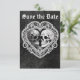Med detta sparar du datumkortet kan du fira kärlek på all sak gotik och mörk. Den svarta och vita bilden av två leende snöre-filigree-hjärta är perfekt för en got eller Halloween bröllop. Skapat av Farmhouse Press, det är en del av Mörken Gothic Black & White Skull Couple Heart bröllop Suite.