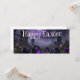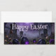 En mystisk påskscen inställd i en dimmig kyrkogård med lysande lila ägg och en gotisk katedral i bakgrunden. Mörka toner, dimmig atmosfär och kuslig belysning skapar en unik och kuslig twist på traditionell påsksymbolik.