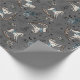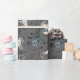 Den här Mörken är Grått Baby Goth Rocking Horse Wrapping Papper med handritade illustrationer av en vintage av en rockande häst med Fransk blå detaljer, ro i matchande blues och krämer, vilda blommor, löv, svart fladdermus, spindelnät och roterande stjärnor, allt mot mörkens bakgrund. Perfekt för gotiska babyduschar eller tillfälle som firar pojke under föreställningen Halloween-säsongen.