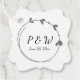 Små favorittaggar med tråd för dina favoritlådor eller andra favoritpresentbehållare för din bröllop eller möhippa och har en mörk grått färg, en enkel hjärtkrans tillsammans med briden och brudgummens initialer och bröllop-datum i svart, stiliserad skrift. Baksidan av märkrn innehåller ord av tack. Redigera förmånstaggen initialer och datum och ersätt med ditt eget. Välj önskad märkordsform. Obs! Du kan behöva ändra storlek på hjärtkransens utformning med några av de positiva taggformerna.