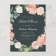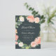 Modern blommigt inbjudningskort för möhippa med rosa och persikofärgade peonier och ro med eukalyptus greenery på mörkens grått-bakgrund. Perfekt för botaniska möhippor i vår eller sommar.