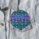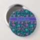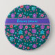 En söt runt Button eller Badge, med en mönster av ljusa blommor i lila, turkos, rosa och orange på mörk grönt bakgrund, från en handmålad papper kollage av Judy Adamson. Om du vill kan du enkelt ändra bakgrunden till färg genom att klicka på Redigera.