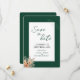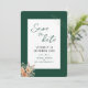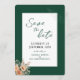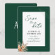 Mörk grönt "spara datumet" för bröllop, med vattenfärgade aprikoser och trädgårdslöv. En enkel, men elegant contemporary botanisk design inspirerad av boho vintage stil, med monogram på baksidan.