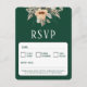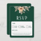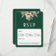 Mörk grönt svarskort med vattenfärgade aprikoblommor och trädgårdslöv. En enkel, men elegant contemporary botanisk design inspirerad av boho vintage stil. Innehåller utrymme för QR-kod och bröllop webbplats adress.