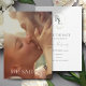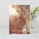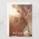 Ett vackert, vitt och platt bröllop spara datum-annonskort med mörk, med grönt av grönt av , färg, mot vit bakgrund. Den här mallen innehåller ett foto med "Hon sa JA!" längst fram. Kortets baksida innehåller all information om Spara datum och ett underbart par monogram i mjuk mynta grönt.
