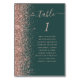 Det moderna kortet för bordsnummer i bröllop som är lämnat kant i eleganten har ett faux glitter guld i ro. Ord "bord" visas i handskriftsskript i ro rosa på mörk grönt bakgrund. Lägg till namnen för de gäster som tilldelats varje bord.
