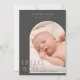 Det här lodrät med fotoförlossning i elegant har en modern ljusbågsformad bild av palettonerna ram och färg i neutralt. Frasen "Hej, World" delar din glädje och klassiska typografidetaljer. Baksidan har en ljusare ton färg med utrymme för ett foto- och familjemeddelande för vågrät.