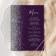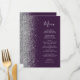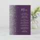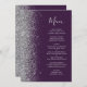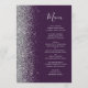 Den moderna bröllop-menyn på den lämnat kant i eleganten har ett faux silver glitter gräns. Anpassadet kombinerar silver grått med-handskriftsskript och kopparplåt typsnitt på mörkens lila-bakgrund. Den omvända sidan har en passande lila- och silver glitter-design.