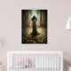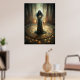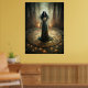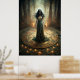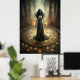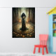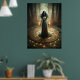 En häxa står inom en glödande rituell cirkel, flammar och pulserar från alla håll. Denna fängslande gotsiska poster framkallar gamla riter, helig-symboler och den obearbetade kraften hos den monontända magin. Ett slående tillägg till meditationsrum, altarutrymmen eller Halloween-dekoration med en mörk femininin beröring.
